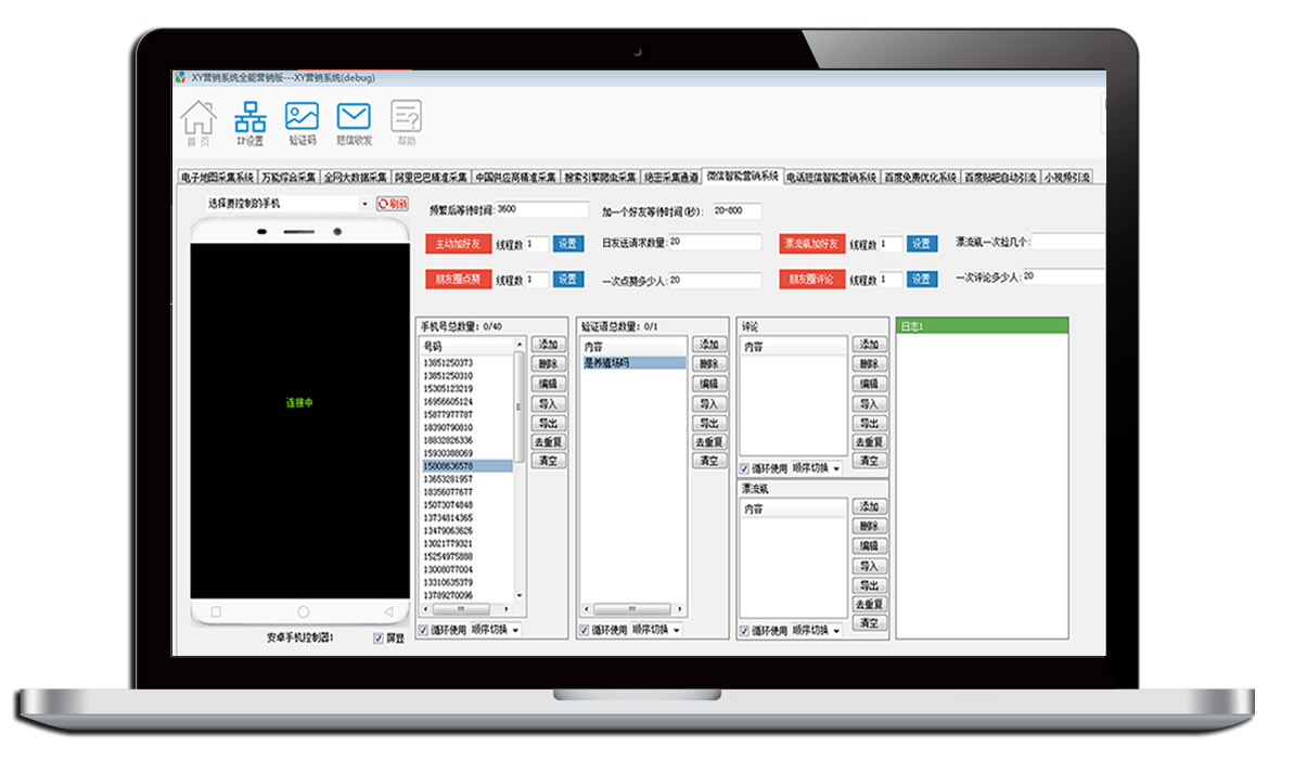 一套群控系统,通过电脑批量控制一批手机,实现几十到几百台手机微信的自动化推广营销;只需一人一电脑即可控制上百台手机,相当于百名业务员免薪自动工作,降低人工成本。创新群控引擎,高效传输技术,GPS虚拟定位,多软件控制;一键群控 自动吸粉 移动营销 粉丝倍增。